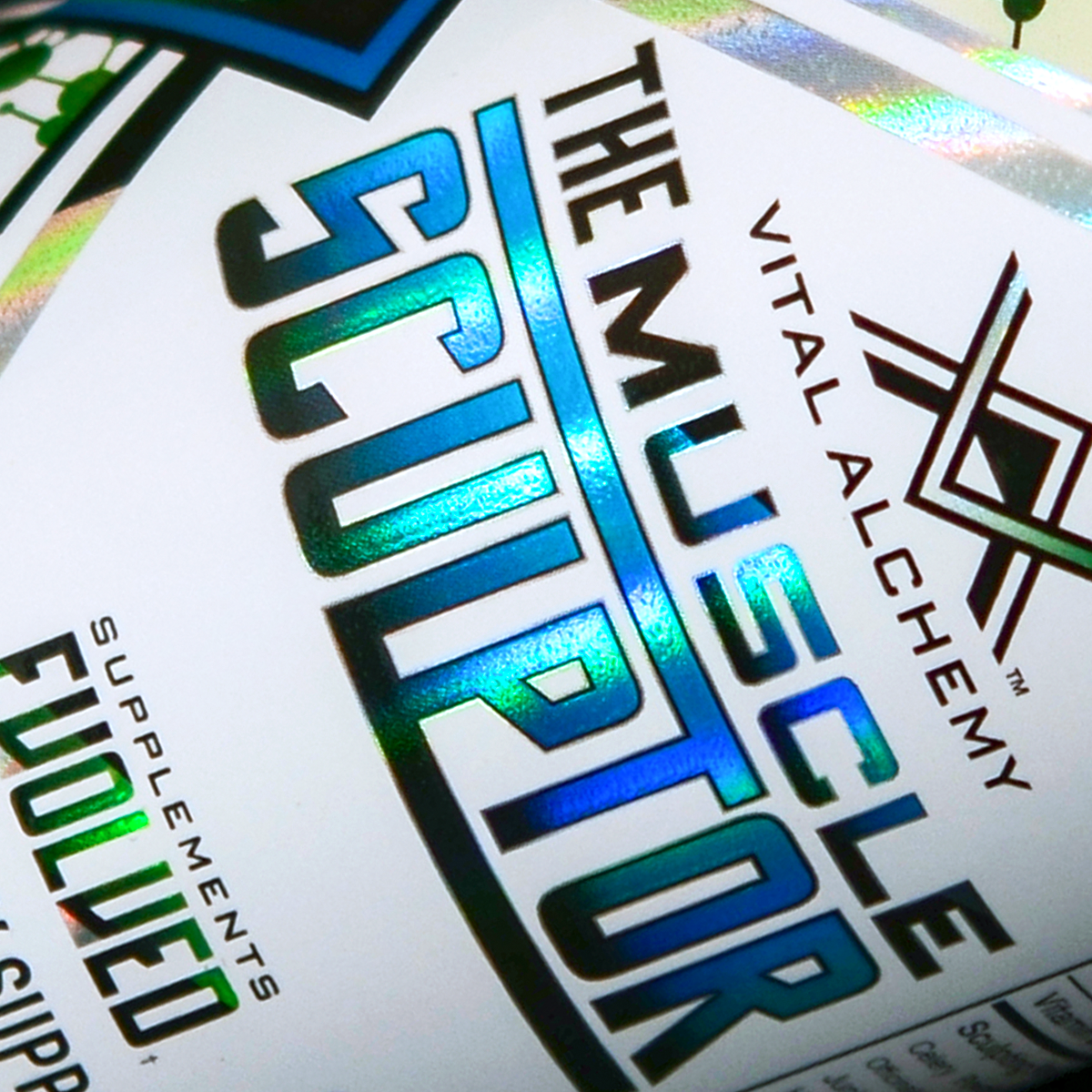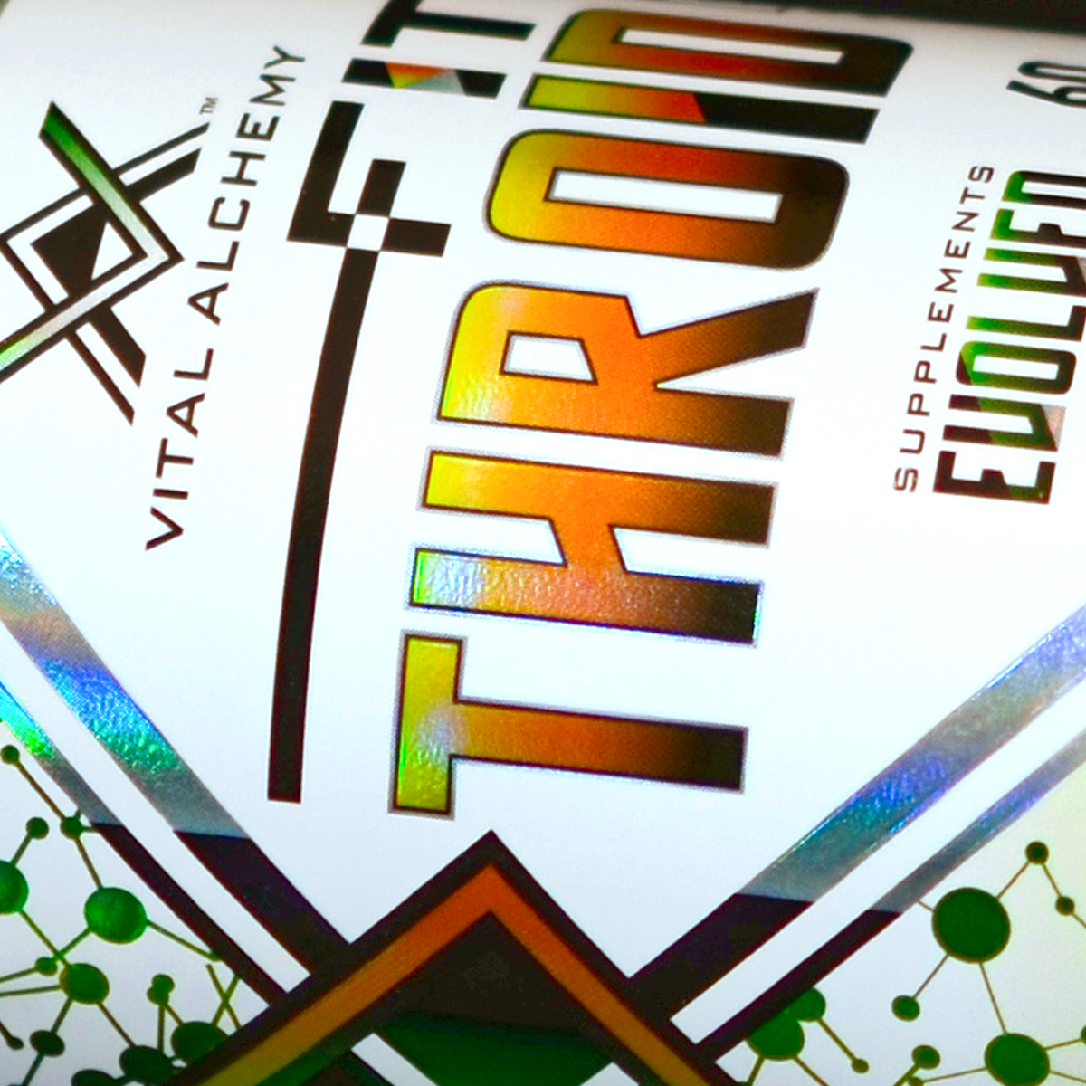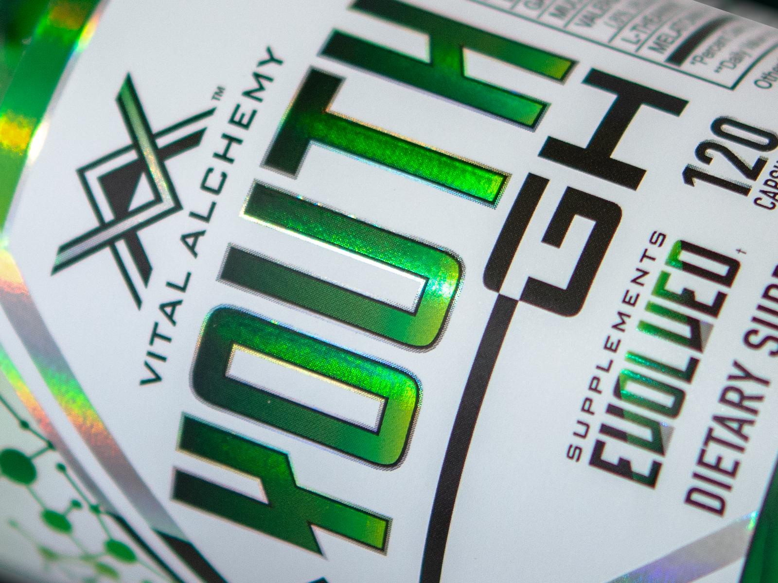 CLIENT: Vital Alchemy, Supplements Evolved. PROJECT: Brand logo, brand icon, packaging design, print materials, and press set ups.