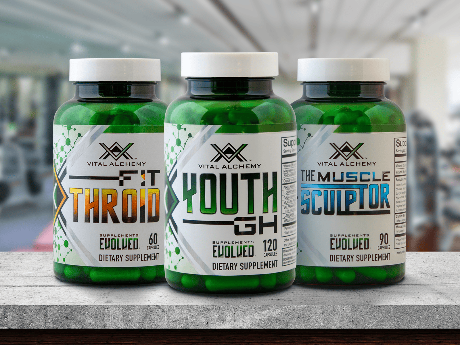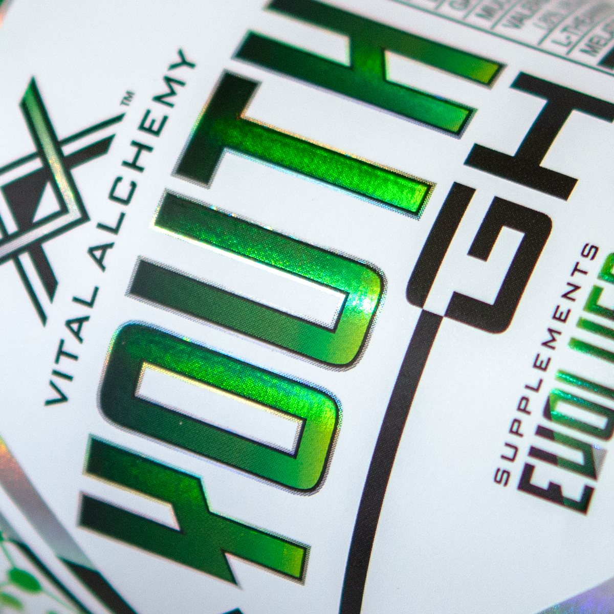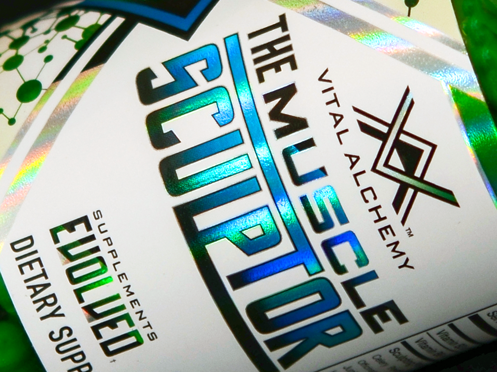 CLIENT: Vital Alchemy, Supplements Evolved. PROJECT: Brand logo, brand icon, packaging design, print materials, and press set ups.